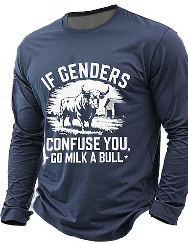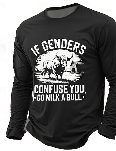 T-Shirt Grafica Umoristica a Maniche Lunghe per Uomo con 'Se i Generi ti Confondono Vai a Mungere un Toro' Design Idiomatico