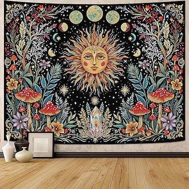 fasi lunari sole fungo cristallo arazzo da parete cottagecore estetica strega arredamento stanza yoga meditazione arte casa tessuto poster
