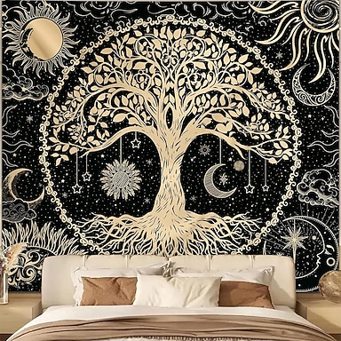 Arazzo da parete celeste con albero della vita in oro e nero, sole, luna, stelle, astrologico, mistico, boho, hippie, mandala, da appendere alla parete per camera da letto, soggiorno, dormitorio,