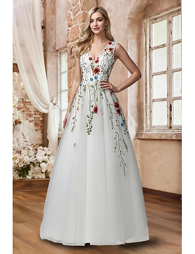 Abiti da sposa A-Line scollo a V senza maniche lungo fino al pavimento in satin abiti da sposa con applicazioni in un colore solido