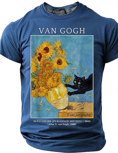 Maglietta da uomo con stampa grafica divertente di un gatto nero e girasoli di Van Gogh, stile impressionista, regalo per amanti dei gatti, edizione rubata, maniche corte, casual, abbigliamento