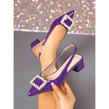 décolleté da donna in vernice viola con cinturino posteriore - tacchi bassi a punta con fibbia di perle per feste notturne e look glamour serali