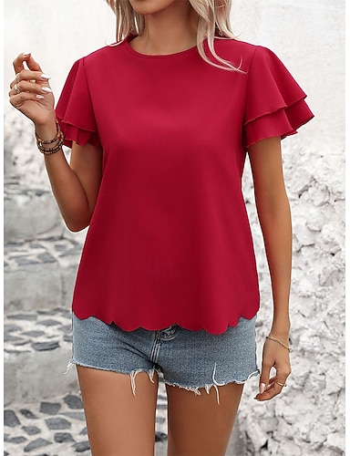 Per donna Maglietta Taglio Bottoni Tinta unica Vintage Elegante Casual Manica Corta Manica a Balze Girocollo Top Regolari Quotidiano Uscire Rosso Estate Primavera