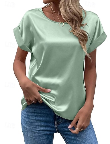 Per donna Elegant Top in raso Maglietta A calotta di seta Semplice Moda Moderno Manica Corta Girocollo Top Regolari Quotidiano Uscire Weekend Verde chiaro Verde scuro Viola Grigio chiaro Estate