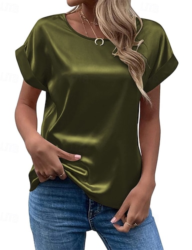 Per donna Elegant Top in raso Maglietta A calotta di seta Semplice Moda Moderno Manica Corta Girocollo Top Regolari Quotidiano Uscire Weekend Vino Verde militare Blu marino Cachi Beige Estate