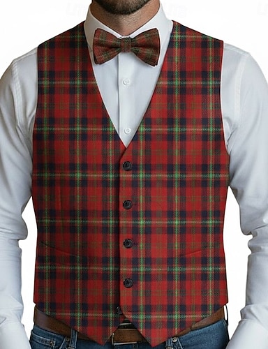 gilet da uomo, gilet da vacanza, festa, moda autunno inverno, tasche, bottoni, poliestere, comodo, scozzese, monopetto, quattro bottoni, scollo a V, vestibilità regolare, rosso scuro, gilet rosso