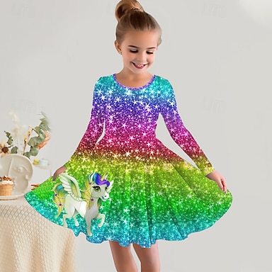 ragazze' 3D Pop art Cartoni animati Unicorno Vestito Manica lunga Stampa 3D Estate Autunno Da mare Sportivo Giornaliero stile sveglio Informale Bellissimo Bambino 3-12 anni Abito casual Abito linea A