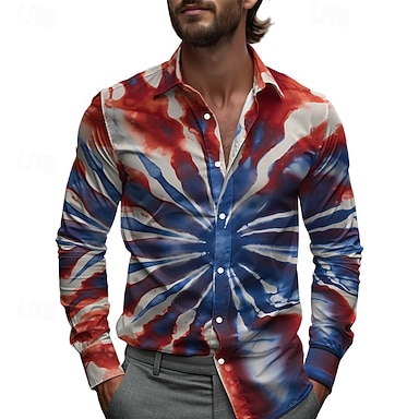 Camicia da Uomo Bandiera Americana Camicia Casual Camicia da Spiaggia Manica Lunga Casual Confortevole Vacanza Street Hawaiian Primavera Autunno Colletto a Stampa Rosso Blu