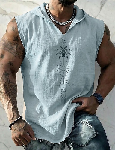 Felpa con cappuccio senza maniche da uomo con stampa geometrica di palma, sole, barca a vela e luna, stile boho costiero, canotta grafica, vestibilità ampia, scollo a V, orlo sfrangiato, estate,