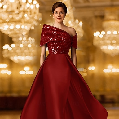 Linea ad A Lunghezza al pavimento Abito da Sera Abito da ballo con sopragonna Abito formale Elegante Scintillante Setoso Manica Corta Monospalla Festa serale Matrimonio Raso Con Paillettes con Glitter