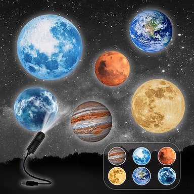 Proiettore di pianeti USB 6 in 1, luce notturna, proiettore di Terra, Luna, Marte, Giove e galassie con collo d'oca flessibile a 360°, lampada portatile per proiezione di cielo stellato sul soffitto