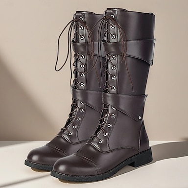 stivali da uomo in similpelle nera con lacci e cinturini con fibbia, stivali da combattimento vintage da equitazione per il palcoscenico e le feste