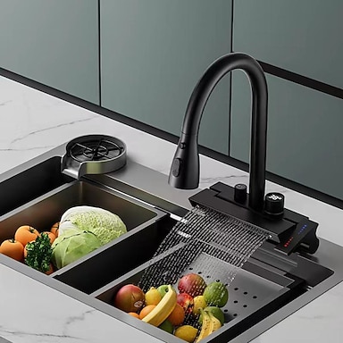 Rubinetto Cucina A Cascata Estraibile Miscelatore Lavello Vasca Rubinetti Display Digitale Lcd, Con Tubo G1/2 Freddo E Caldo