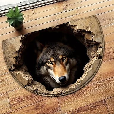 zerbino con illusione ottica 3D a semicerchio, stampa piatta 2D con lupo realistico che sbircia attraverso il terreno accidentato, tappeto con vivido design di animali