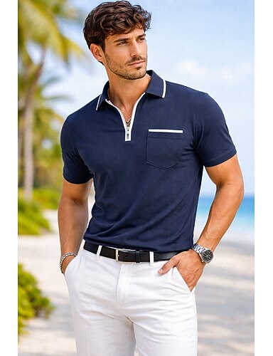 Per uomo Polo con zip Maglia da golf Casuale Fitness Bavero Zip a un quarto Manica Corta Moda Moderno Tinta unica Cerniera Tasca Estate Primavera Tutte le stagioni Bianco Borgogna Blu marino Polo con