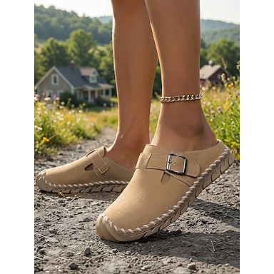 Zoccoli da donna color kaki cuciti a mano – scarpe mule chiuse con fibbia regolabile, ideali per camminare, per il giardino, per viaggiare e per l'uso quotidiano casual.