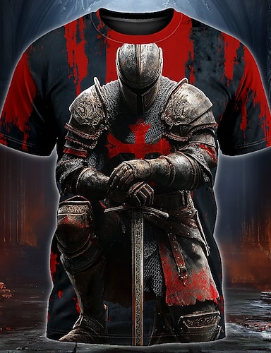 T-shirt da uomo con stampa integrale, croce rossa, spada e scudo, stile crociato, medievale, cristiano, vintage, eroico, a maniche corte, vestibilità casual, streetwear, abbigliamento di design,