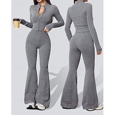 Per donna Tuta da yoga Set da allenamento da 2 pezzi Tinta unica Completo Abbigliamento Autunno Inverno Grigio scuro Nero Atletico Sportivo Pilates Vita Alta Controllo addominale Manica Lunga Sport