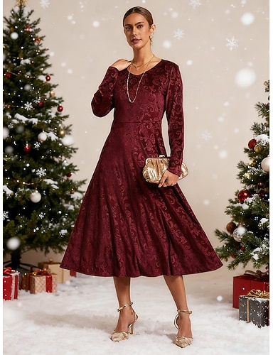 vestito midi da donna natalizio, abito tubino, abito in velluto, paisley, elegante, festa, matrimonio, invitato, vacanza, grafico, manica lunga, scollo a V, vino, primavera, autunno, inverno