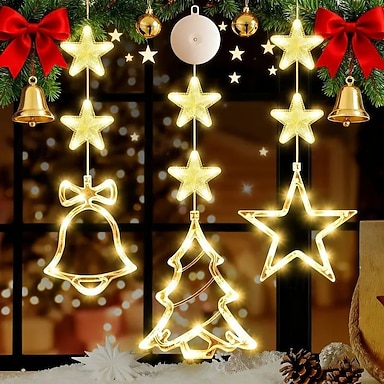 1PC Luce Natalizia da Finestra a Batteria Appesa Luce Cortina Bianco Caldo con Ventosa Campana Albero di Natale e Luce Stella per Decorazione Finestra di Natale Capodanno Festa