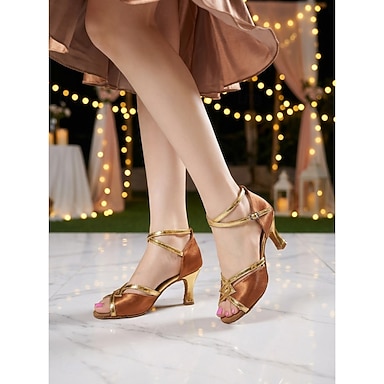 marrone da donna &scarpe da ballo latino dorate - tacco medio, design con cinturini, ballo da sala, salsa, tango, pratica &calzature performanti