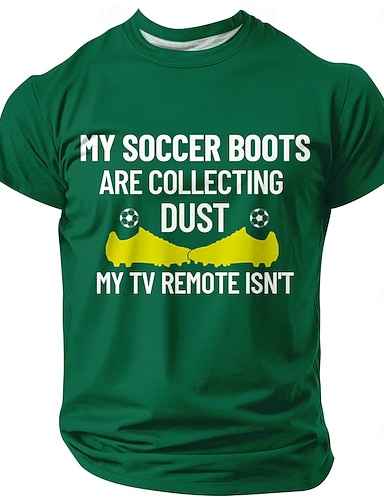 Torneo mondiale di calcio 2026 scarpe da calcio da uomo tacchetti telecomando tv polvere divertente sarcastico tifoso sportivo maglietta verde grafica vestibilità regolare giorno della partita visione