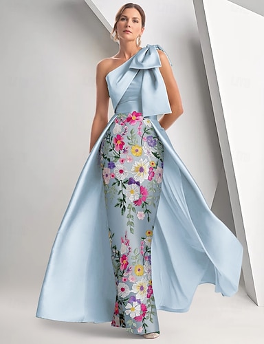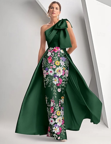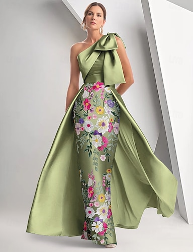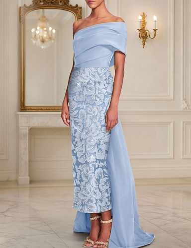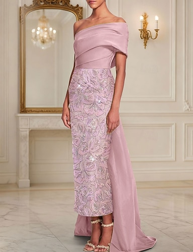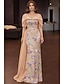 タイト/コラム フロア丈 ビーズ刺繍 フォーマルドレス 花嫁の母のドレス イブニングドレス オーバースカート付きボールガウン フォーマルドレス エレガント ヴィンテージ きらびやかな 半袖 オフショルダー 結婚式 フォーマル サテン スパンコール とともに グリッター素材 ショール