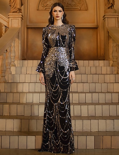トランペット/マーメイド フロア丈 卒業ドレス イブニングドレス 成人式ドレス ボールガウン エレガント 長袖 クルーネック プロムドレス パーティー スパンコール とともに スパンコール