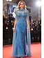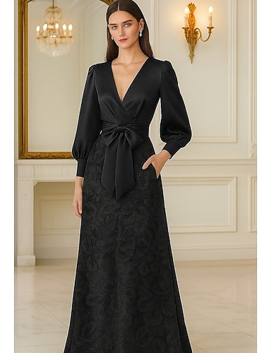 Aライン フロア丈 イブニングドレス ボールガウン フォーマルドレス エレガント カラーブロック 高分割 長袖 Vネック フォーマル 結婚式のゲスト 帯・帯 サテン とともに スリット