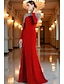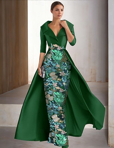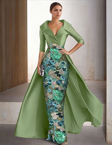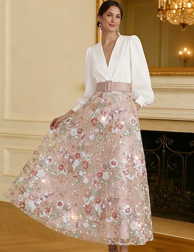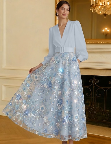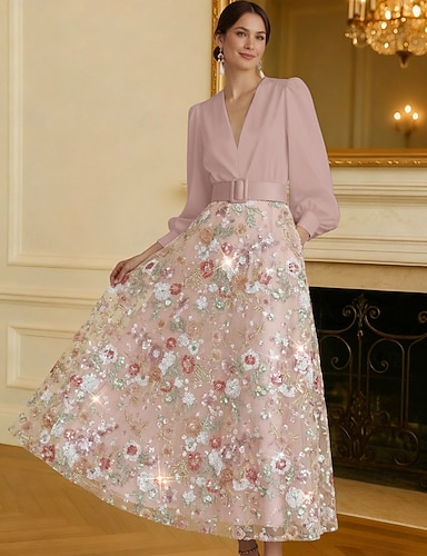 タイト/コラム アンクル丈 ビーズ刺繍 フォーマルドレス 花嫁の母のドレス カクテルドレス 卒業ドレス イブニングドレス ボールガウン エレガント カラーブロック シルキー 長袖 Vネック 結婚式 フォーマル サテン スパンコール とともに グリッター素材 スパンコール
