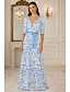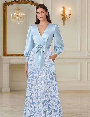 Aライン フロア丈 イブニングドレス ボールガウン フォーマルドレス エレガント カラーブロック 七分袖 Vネック 結婚式 フォーマル シャンパンマザーオブブライドドレス サテン とともに フラワープリント リボン スリット