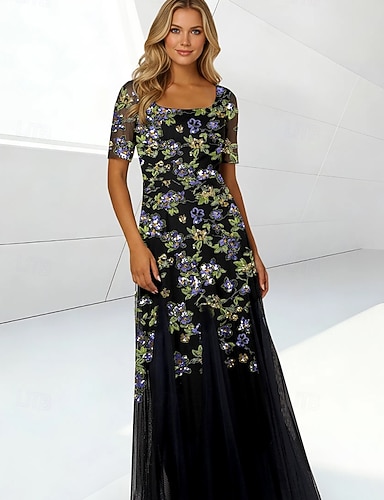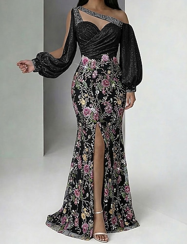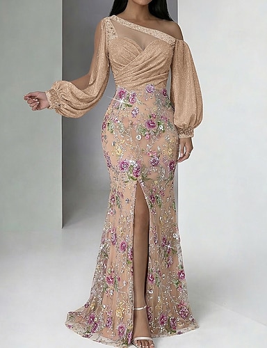 シース/コラム フロアレングス フォーマルドレス イブニングガウン エレガント ビンテージ 長袖 ボートネック プロム イブニングパーティー 刺繍花 ビーディング スパンコール付き