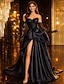 Aライン ブラックイブニングガウン エレガントドレス フォーマル コートトレイン 長袖 オフショルダー サテン ボタンとプレーツ スリット付き マスカレードドレス