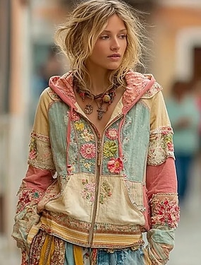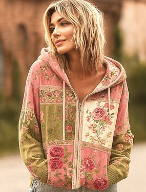 女性用 ジップアップパーカー パッチワーク ジッパー ポケット フラワー グラフィック エレガント あたたか ヴィンテージ 長袖 フード付き レギュラートップス ストリート 日常着 グリーン カーキ色 春 秋