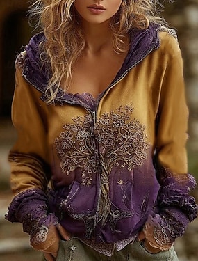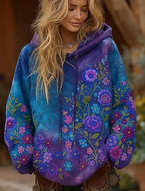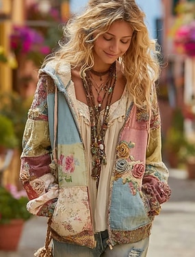 女性用3Dプリントビンテージボヘミアンフーディーパッチワークフーディースウェットシャツフローラルジップアップカジュアルフード付きストリートデイリーウェアパッチワークジッパーポケットライトパープル紫茶色緑春秋