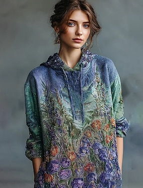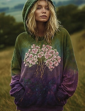 女性用3Dプリントビンテージボヘミアンフーディーパッチワークフーディースウェットシャツフローラルプルオーバースウェットシャツカジュアル長袖フード付きストリートデイリーウェアフロントポケット草色ライトピンク紫緑春秋冬