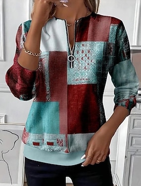 女性用 プルオーバースウェットシャツ ジップアップスウェットシャツ ジッパー プリント グラフィック 抽象的 ファッション カジュアル 長袖 クルーネック レギュラートップス ストリート 日常着 ブルー ルビーレッド パープル ブラウン グリーン 秋 冬
