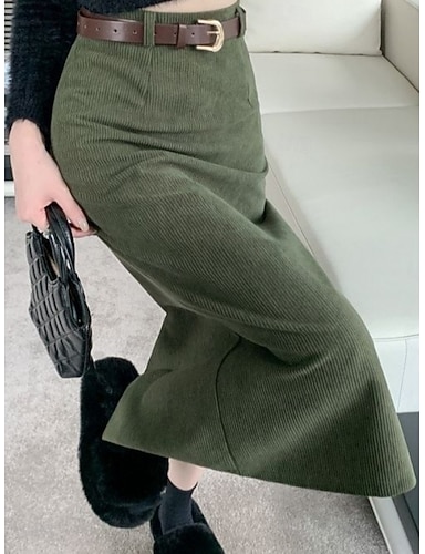 女性用 スカート Aライン ファッション カジュアル ミディ ハイウエスト スカート 平織り マイクロエラスティック ストリート 日常 ブラック アーミーグリーン カーキ色 春 コーデュロイ