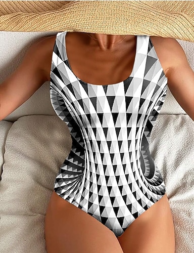 女性用ワンピース水着スリミングカラーブロックお腹引き締めバススーツジオメトリック縦ストライププリントスクープネックノースリーブスポーティーなブラックホワイト夏のビーチプールサイドファッション