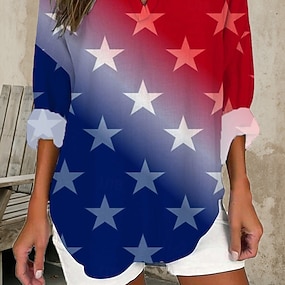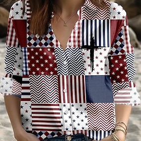 アメリカ独立記念日 女性用 ブラウス プリント グラフィック フラッグ ヴィンテージ トロピカル風 ハワイアン 長袖 Vネック レギュラートップス 日常 祝日 ビーチウェア ブルー ブラック ホワイト ルビーレッド 夏 春