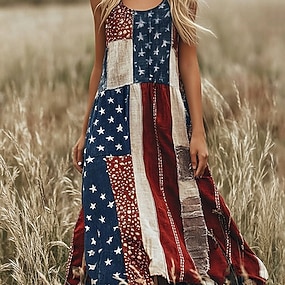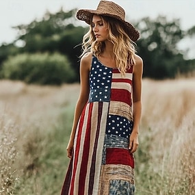 アメリカ独立記念日 女性用 マキシドレス A ラインドレス スリップドレス 旅行度假风 カジュアル ビーチ お出かけ レギュラー グラフィック 星条旗 ノースリーブ Vネック ブルー ルビーレッド 夏 春