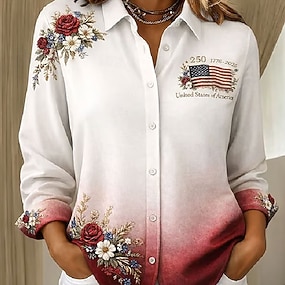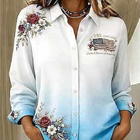 アメリカ独立記念日 女性用 シャツ ボタン プリント フラワー グラフィック フラッグ エレガント ヴィンテージ スタイリッシュ 長袖 シャツカラー ロングトップス 日常 ワーク ブルー ワイン ブラウン グリーン グレー 夏 春 秋 冬