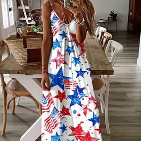 独立記念日愛国的な女性用マキシドレス サンドレス Aラインドレス スリップドレス バケーションカジュアル 外出 ビーチ レギュラーフィット グラフィック スター&ストライプ 国旗 ノースリーブ Vネック