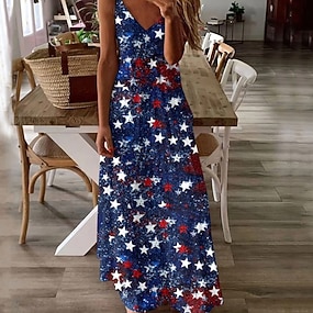 アメリカ独立記念日 女性用 マキシドレス A ラインドレス スリップドレス 旅行度假风 カジュアル ビーチ お出かけ レギュラー グラフィック 星形 ノースリーブ Vネック ブルー ルビーレッド 夏 春