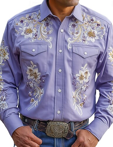 男性用 フラワープリント コサージュ シャツ ウエスタンシャツ カウボーイシャツ 長袖 ヴィンテージレトロ アウトドア カジュアル 作業服 春 秋 折襟 フロントポケット2つ リネンライクシャツ ボタンアップシャツ ライトパープル