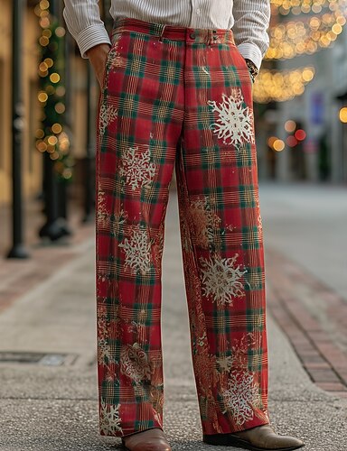 クリスマス 男性用 グリッド / タータンチェック スノーフレーク柄 ズボン スーツ スーツパンツ ミディアムウエスト ファッションカジュアル アウトドア 祝日 サイドポケット付きリラックスフィットフラットフロントドレスパンツ 春 秋 3Dプリント ルビーレッド