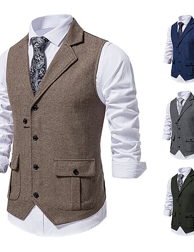 男性用 レトリ/ヴィンテージ ベスト ヘリンボーン テイラーフィット ノッチドラペル シングルブレスト 多ボタン ブルー グリーン カーキ色 2023