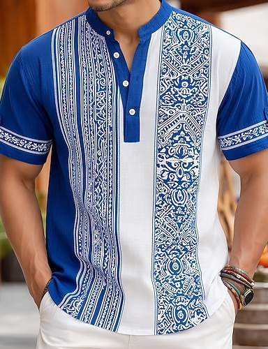 男性用 幾何学模様 エスニック 複雑な花柄 シャツ ボタンダウンシャツ ヘンリーシャツ 半袖 ヴィンテージレトロ 祝日 カジュアル/普段着 夏 春 スタンドカラー ヘンリーカラー 3Dプリント リネンライクシャツ ブルー バーガンディー パープル