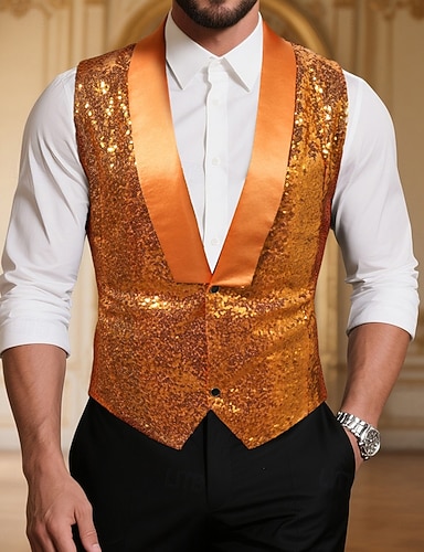 男性用 ベスト チョッキ ジレ バケーション パーティー ビジネス ファッション カジュアル 春 秋 ボタン スパンコール ポリエステル 快適 平織り シングルブレスト 一つボタン Vネック レギュラー オレンジ ベスト