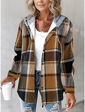 女性用 パーカージャケット アウトドア ストリート デイリーウェア 秋 冬 ロング コート レギュラー 保温 高通気性 スタイリッシュ カジュアル ジャケット 長袖 ストライプとチェック柄 ポケット付き プリント ブラック ブラウン グリーン